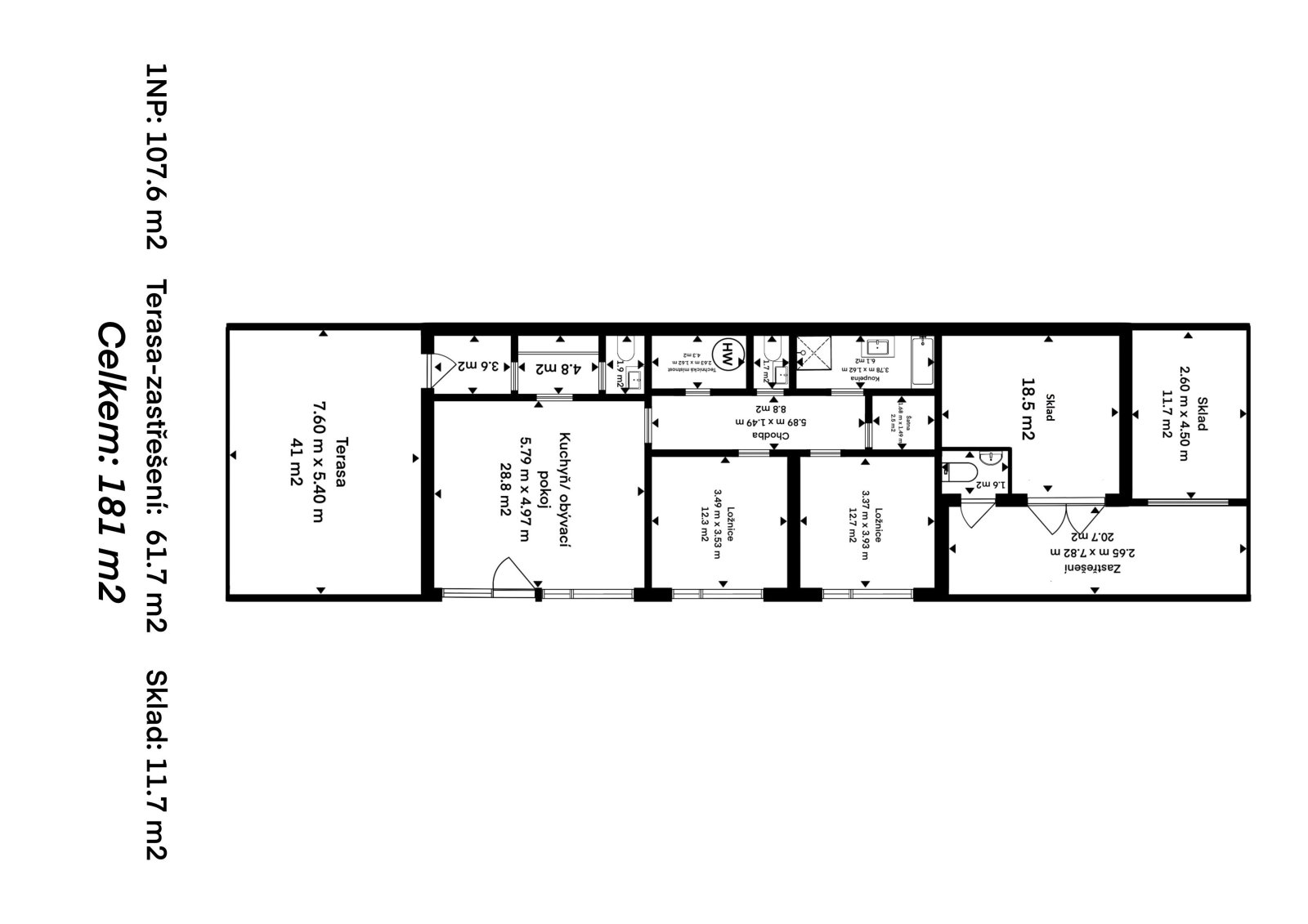 jsou dvě toalety i šatna. V technické místnosti je umístěn prádelní
