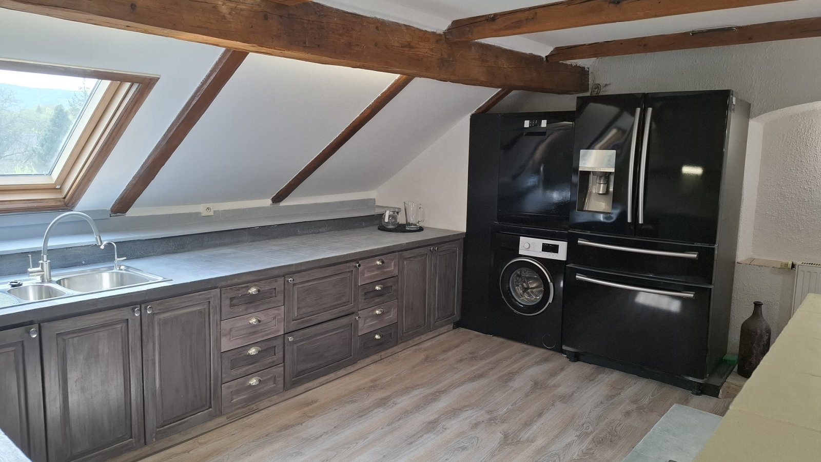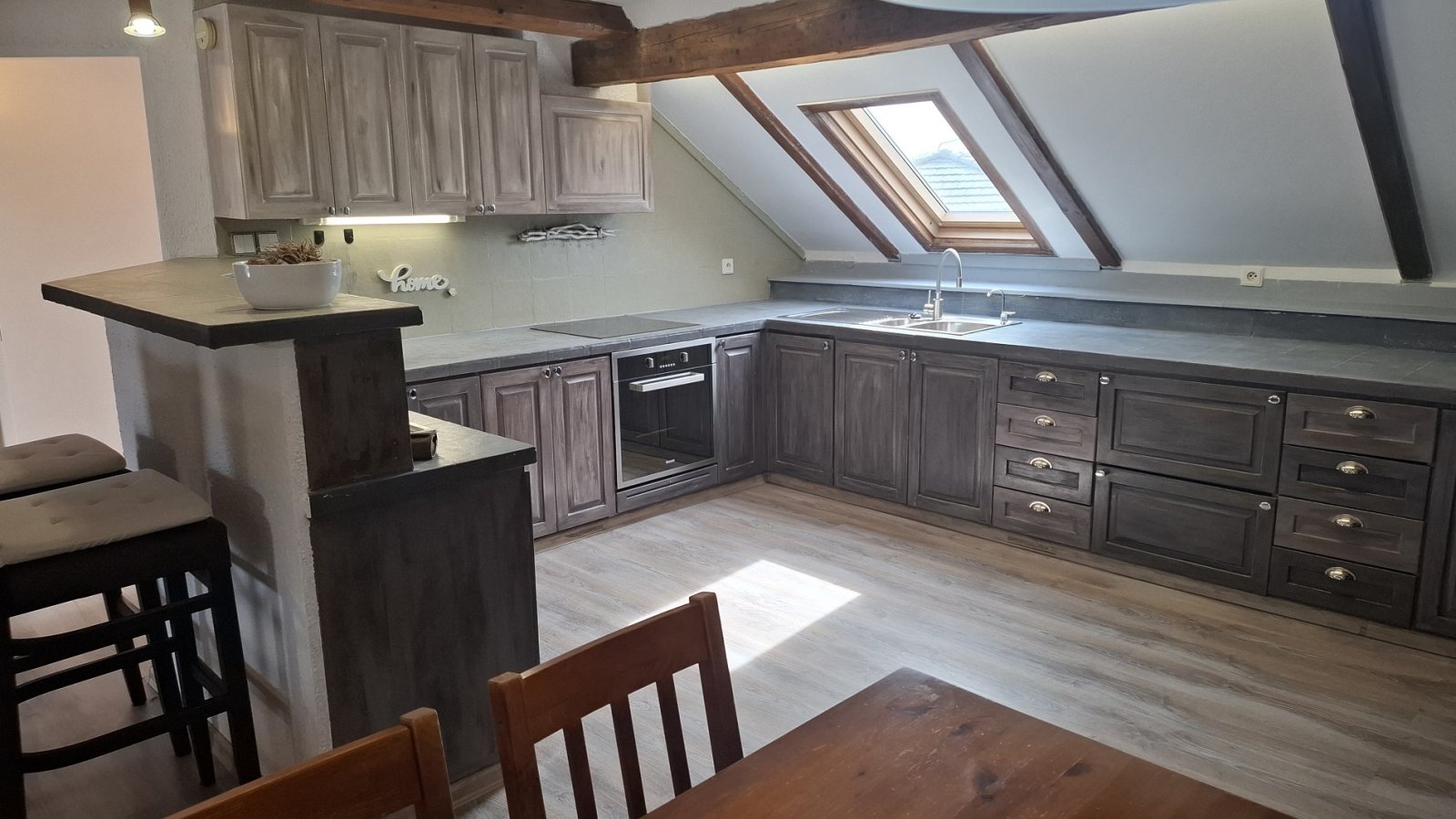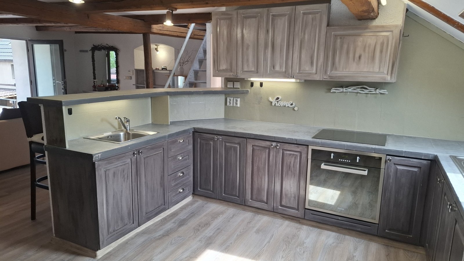 Ve spodním patře bytu je krásná, prostorná kuchyňská linka s vestavnými