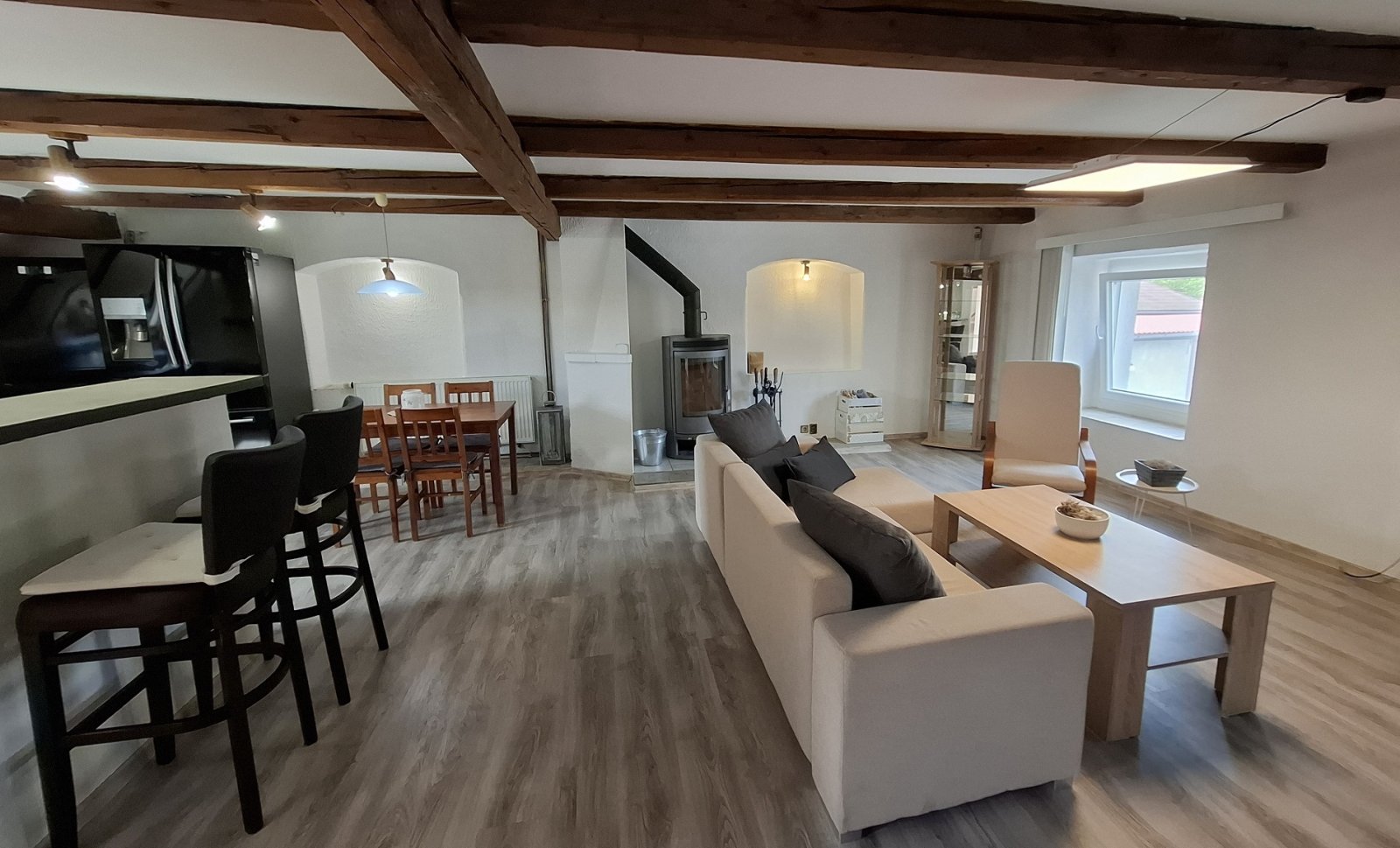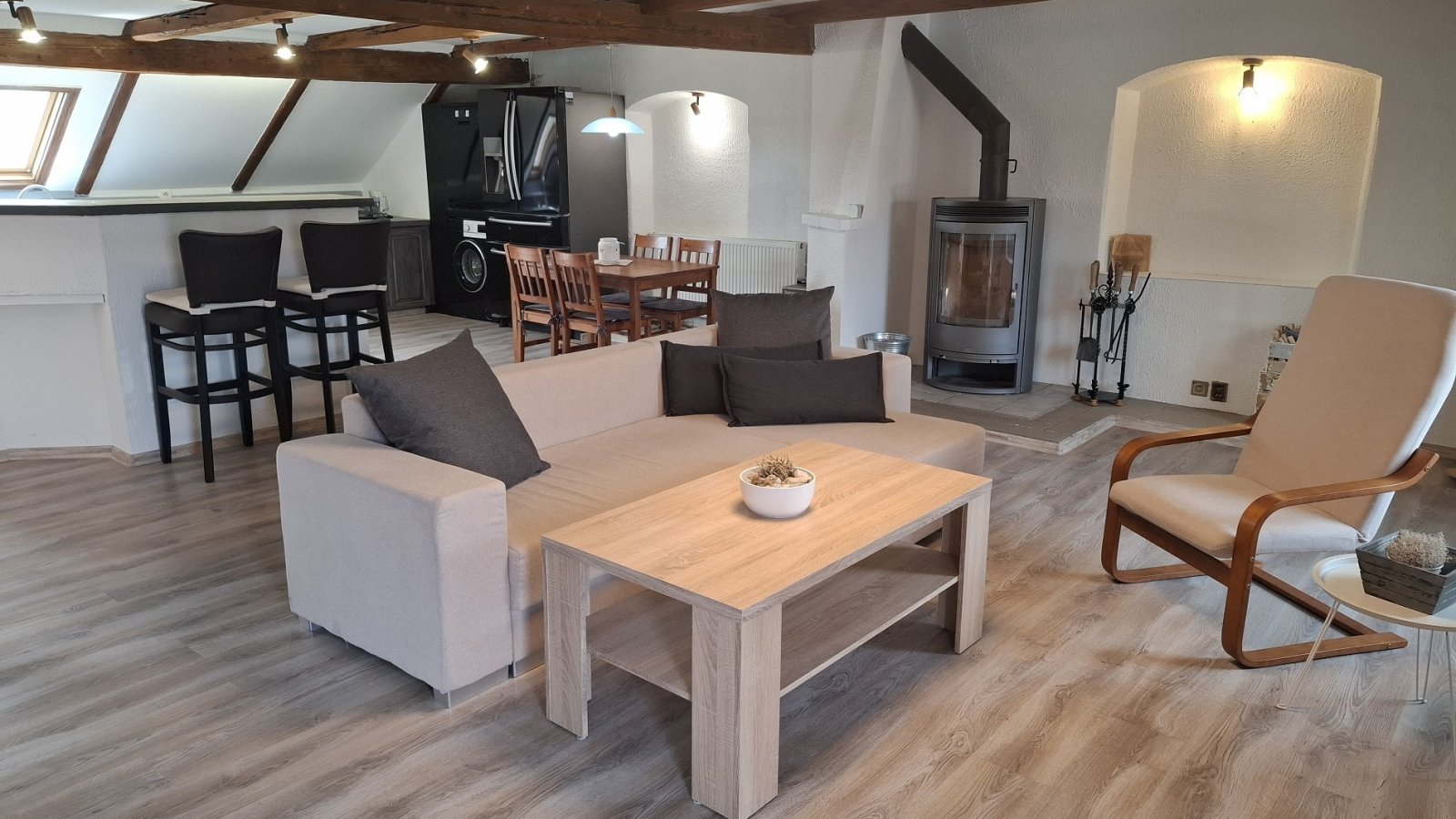 Na kuchyň navazuje obývací pokoj s krbovými kamny.